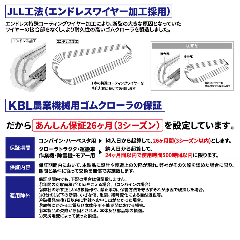 | KBL製ハーベスタ用ゴムクローラーです。このモデルは芯金タイプのクローラーになります。 エンドレス製造で非常に丈夫で長持ちします。製品保証付きなので安心してご利用頂けます。 機械のメーカーと型式、クローラーサイズで適合及び在庫確認をさせて頂きます。 装着後30時間以内に再度テンションの張り調整をして下さい。 安心保証:使用時間500時間まで(最大適用期間24ヶ月) |