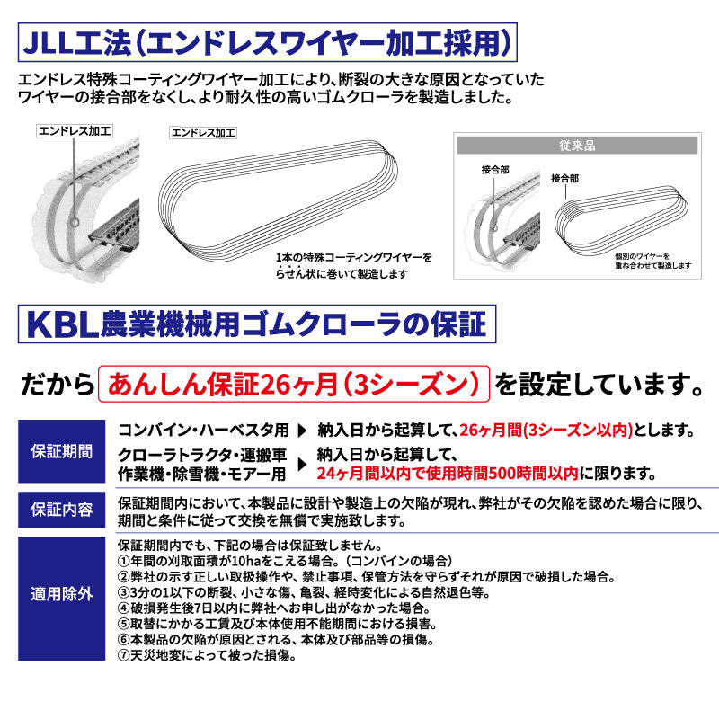 | KBL製タカキタ グランドエース用ゴムクローラーです。このモデルは芯金タイプのクローラーになります。 エンドレス製造で非常に丈夫で長持ちします。製品保証付きなので安心してご利用頂けます。 機械のメーカーと型式、クローラーサイズで適合及び在庫確認をさせて頂きます。 装着後30時間以内に再度テンションの張り調整をして下さい。 安心保証:使用時間500時間まで(最大適用期間24ヶ月) |