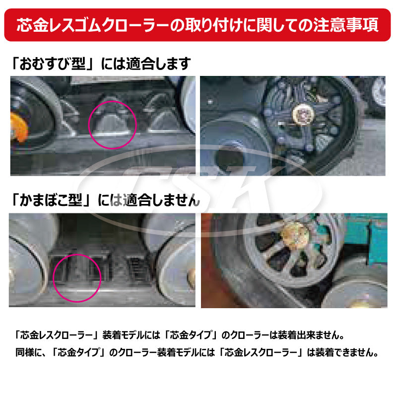 | ご注文前に必ず適合確認(機械のメーカーと型式、クローラーサイズ)をして下さい。 サイズ違いなどお客様都合による返品・交換は行っておりません。 |